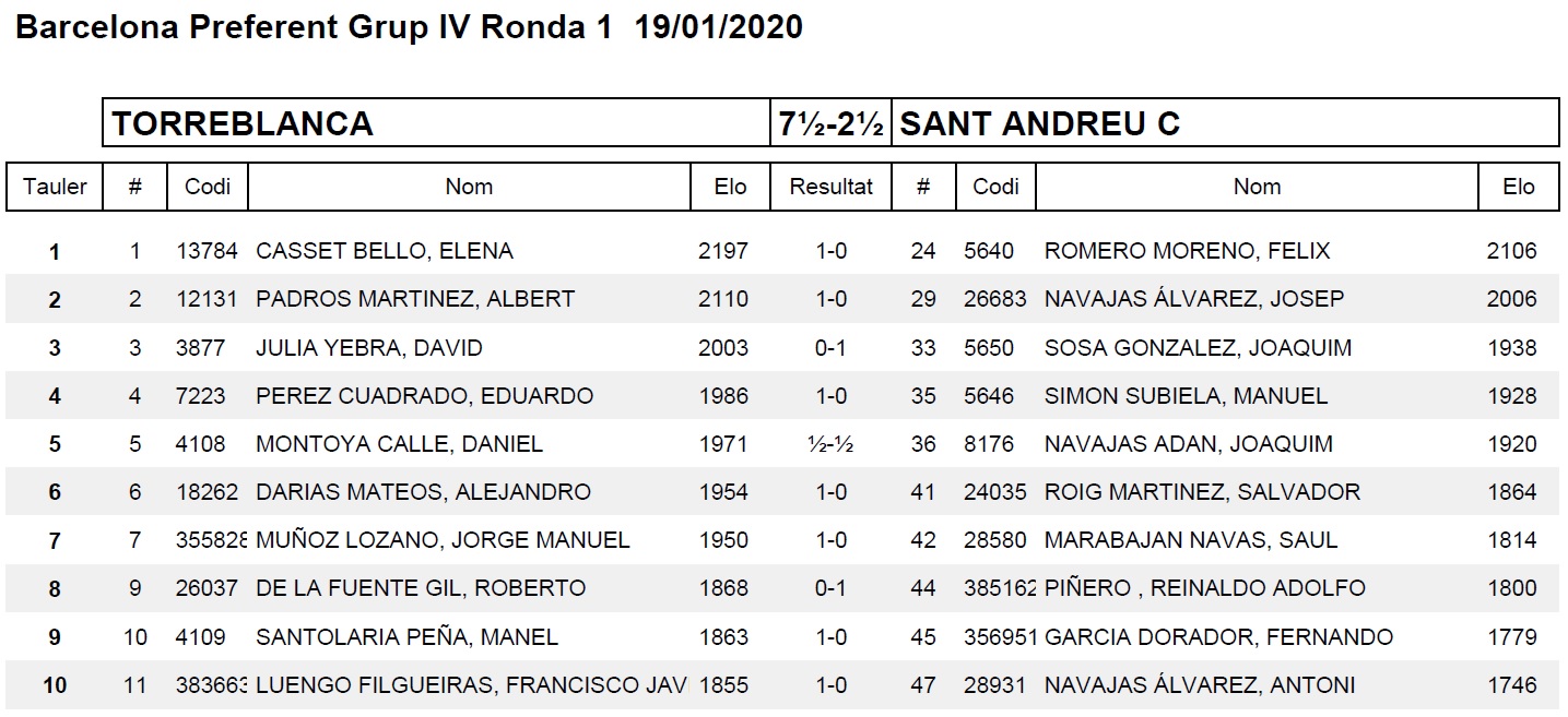 LLIGA CATALANA D’ESCACSDomingo 19 de enero de 2020Categoría Preferente Grupo IVTORREBLANCA 7,5 – SANT ANDREU “C” 2,5